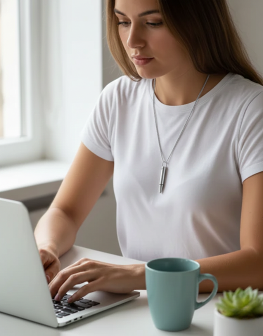 The necklace uses adjustable airflow resistance. When you exhale through the device, it slightly restricts the airflow, activating your diaphragm and respiratory muscles. This builds lung capacity and promotes relaxation.